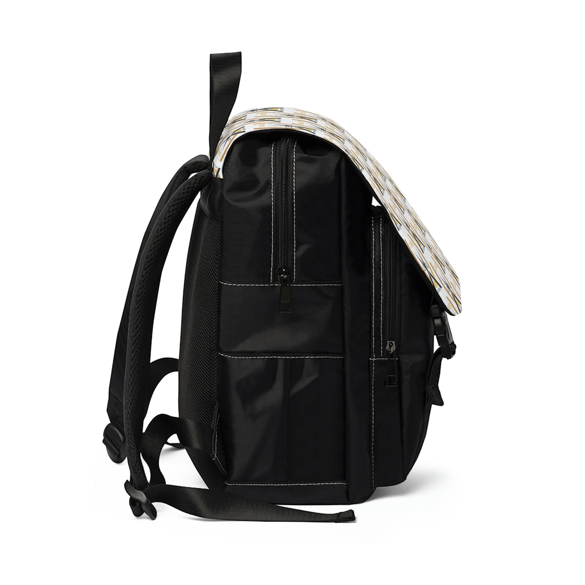 Casual backpack in a classic shape with a front flap design. It is made of durable Oxford canvas. It has two slip interior pockets and one laptop sleeve in the main compartment, a front zipper pocket, and two side pockets.